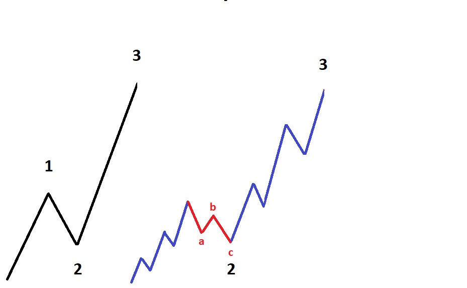 هر موج به موج هایی با درجات کوچکتر تقسیم میشود که آنها هم میتوانند به موج های با درجات کوچکتر تقسیم شود در این حالت هر موج قسمتی از موج یزرگتر و با درجه بیشتری است بزرگترین موج ها یعنی کوچکتر تقسیم شده و تعداد آنها به 34 موج کوچک میرسد موج های 1و2 دو موج ابتدایی از پنج موج پیش رونده اولیه هستند موج سه مربوط به موج درجه بزرگتر بعدی در حال شروع است موج های تصحیح گر یعنی a،b،cبیندازیم که خود آنها بخشی از موج بزرگ تصحیح گر شماره 2هستند ملاحظه میکنید که موج a،cبه این دلیل که هم جهت با موج بزرگتر هستند حرکت میکنند و به پنج موج کوچیکتر تقسیم شده اند و موج (b)چون برخلاف موج بزرگتر حرکت میکند به سه موج تقسیم میشود