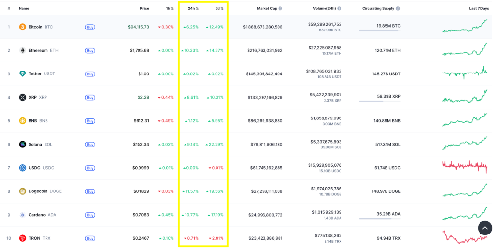 • سولانا (SOL)، دوج‌کوین (DOGE)، و کاردانو (ADA) نیز همگی در بین ۱۰ رمزارز برتر، افزایش قیمت قابل توجهی را تجربه کرده‌اند.