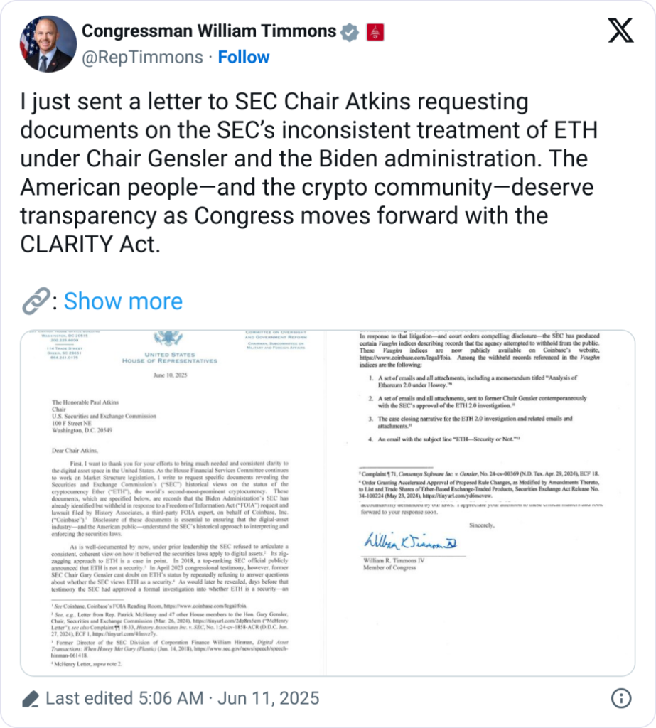 تیمونز در این نامه خواستار دریافت «اسناد مشخص» درباره دیدگاههای تاریخی SEC درباره وضعیت اتریوم شده و معتقد است این اسناد به عموم مردم و کنگره کمک میکند تا رویکرد مدیریت قبلی را بهتر درک کنند. در نامه آمده است: